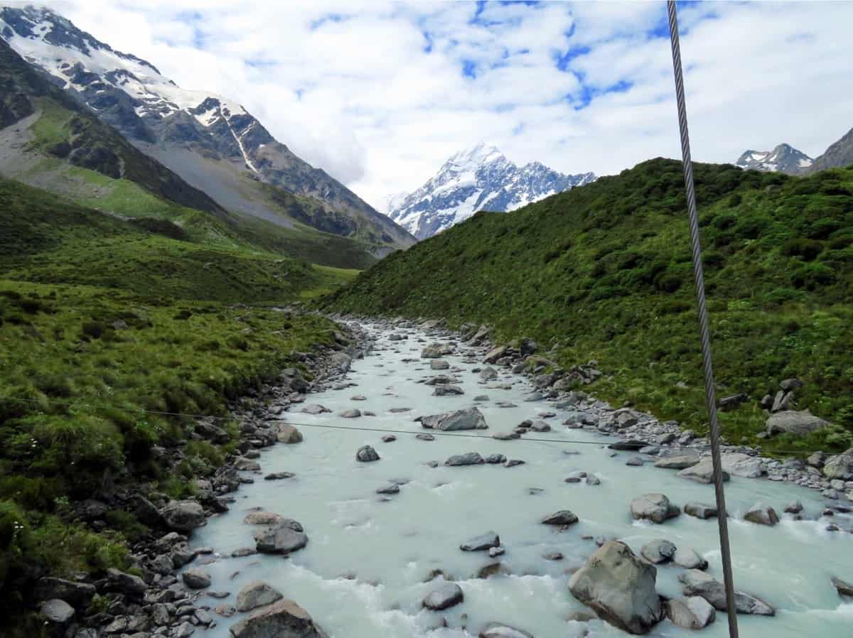 First is the lake from the Mueller Glacier, which I didn’t realize until this trip is actually fed by the glacier—I saw the upper reaches of the glacier on the walk back this time. The lake flows into a river, which joins the Hooker River, and you cross it via a swingbridge—always a highlight to my brothers, of course.