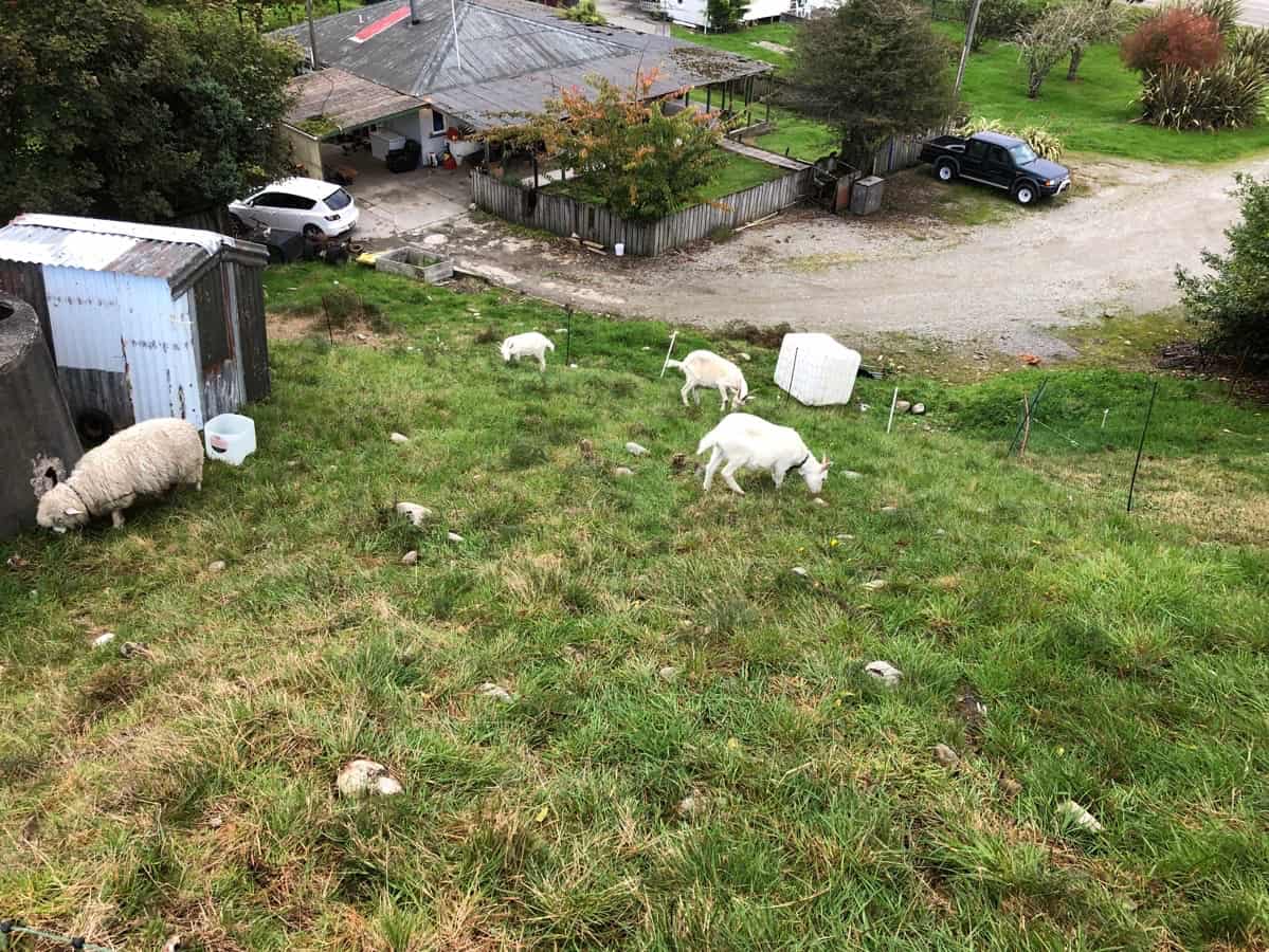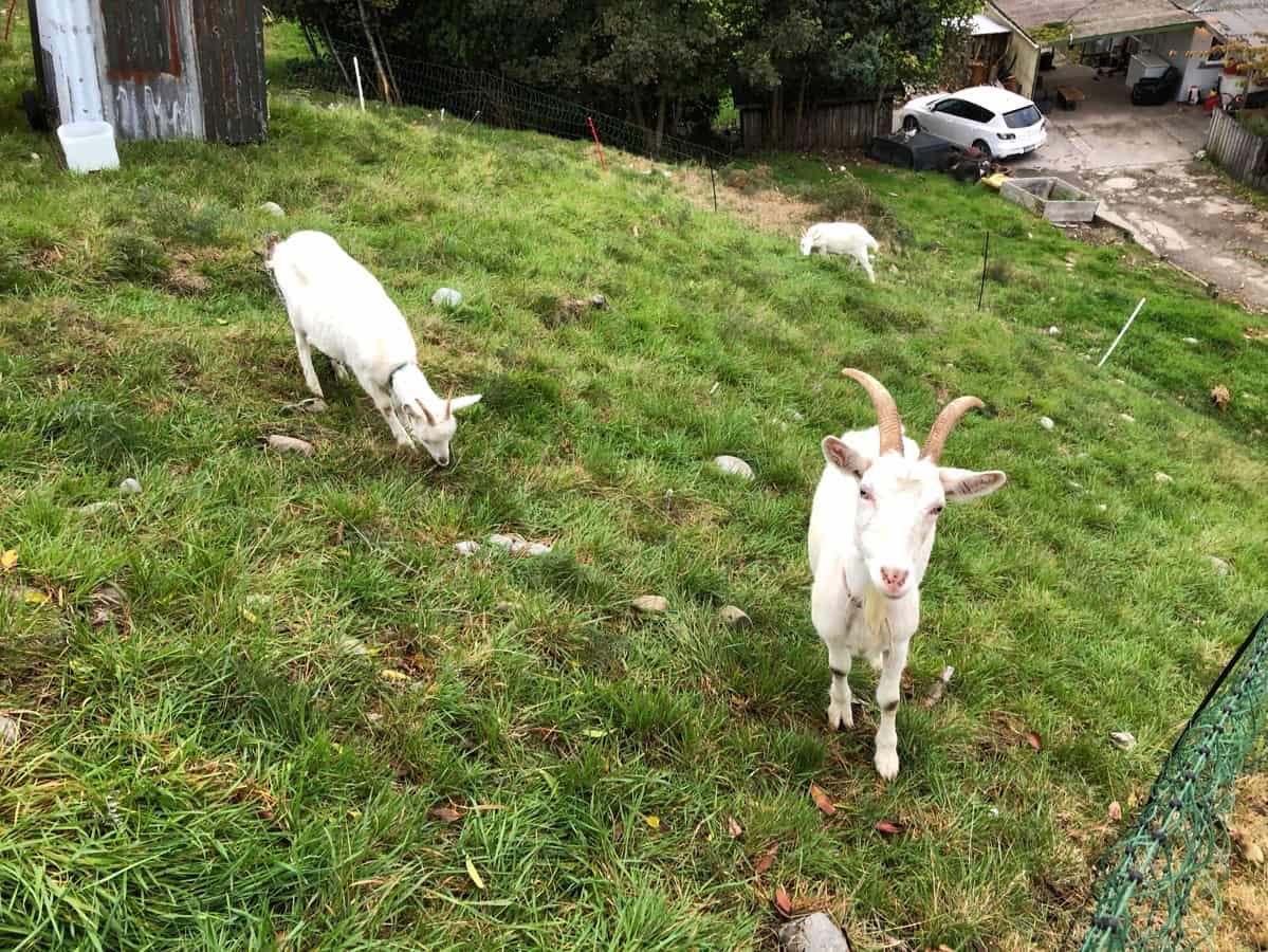 The one on the left (below) is Basil, one of our doe kids; the other is my nanny goat, Sage. In the background is Sassy, our other doe kid.